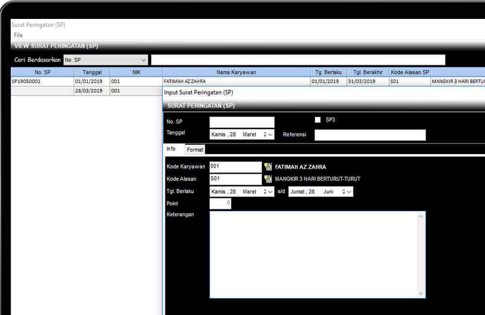 Surat Peringatan merupakan surat yang dibuat untuk karyawan yang telah melakukan kesalahan atau pelanggaran terhadap aturan perusahaan. Meski telah melakukan pelanggaran, perusahaan tidak dapat secara langsung melakukan pemutusan hubungan kerja (PHK) pada karyawan tersebut. Atas dasar itulah dibuat surat peringatan. Surat Peringatan disini terdapat 3 jenis yaitu SP1, SP2 dan SP3, masing-masing memiliki masa berlaku sesuai yang diinput.