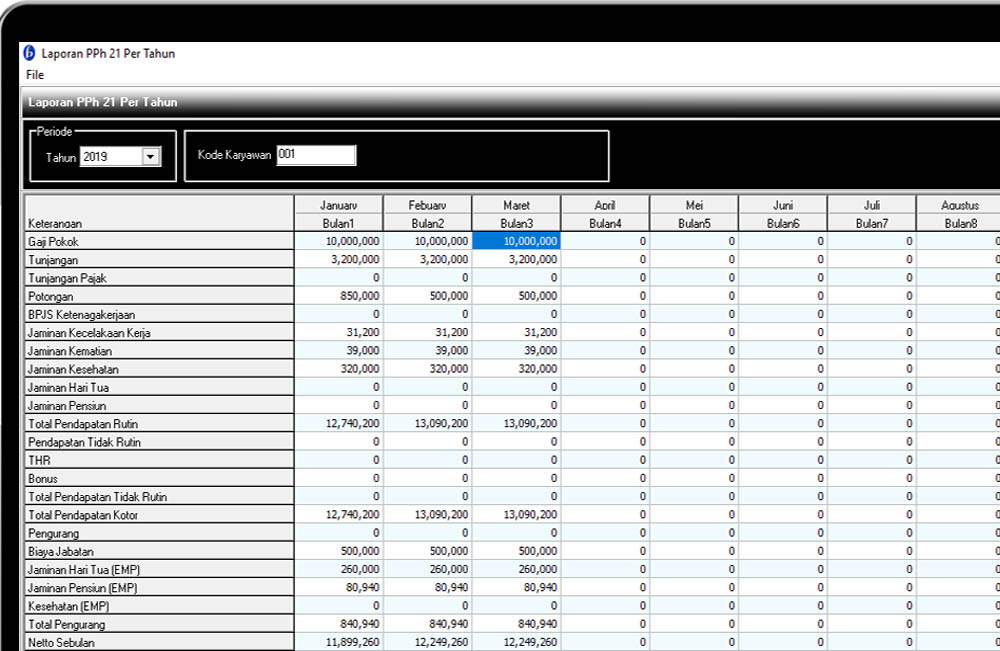 Batik Profesional menyediakan perhitungan PPh 21 secara otomatis, sehingga Anda tinggal mengelola laporan atas perhitungan PPh 21. Laporan tersebut kami sediakan berdasarkan form 1721 seperti :