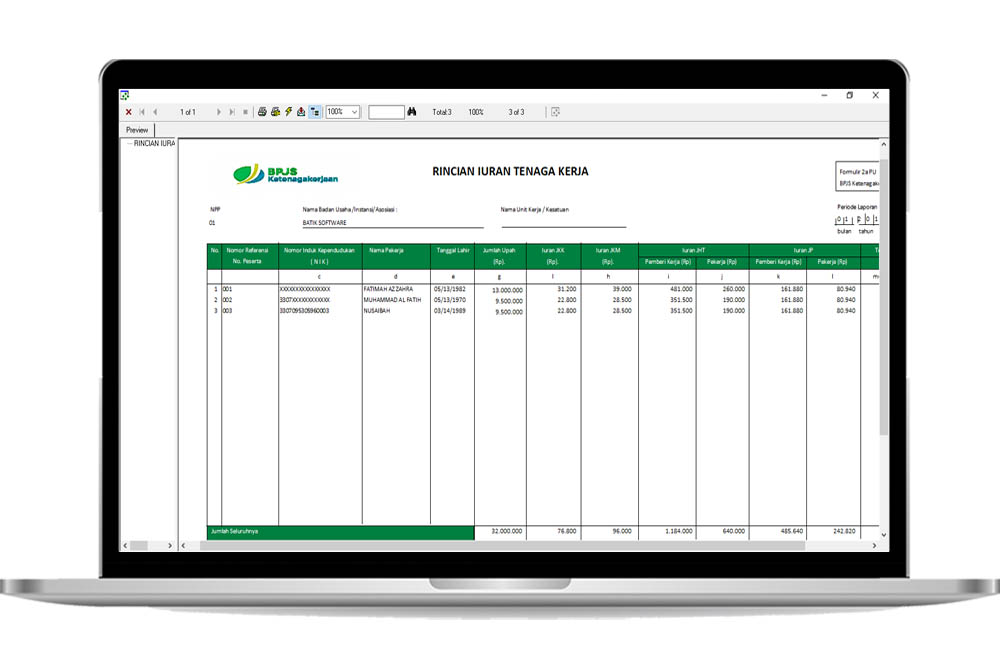 Batik Profesional menyediakan perhitungan BPJS Ketenagakerjaan da Kesehatan secara otomatis, yang nantinya akan berpengaruh terhadap slip gaji dan perhitungan PPh 21. Selain itu, Batik Profesional akan mengeluarkan laporan seperti :