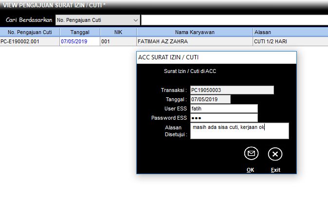 Sebelum dibuatkan Surat Izin/ Cuti, karyawan biasanya akan melakukan pengajuan terlebih dahulu ke bagian HRD atau atasannya masing-masing. Pengajuan ini selanjutnya akan di lakukan Acc/Tolak oleh HRD atau atasan. Masalahnya adalah ketika HRD/atasan tersebut tidak ada dikantor untuk jangka waktu lama, maka atasannya HRD atau atasannya atasan dapat melakukan Acc/Tolak untuk pengajuan cuti karyawan tersebut.