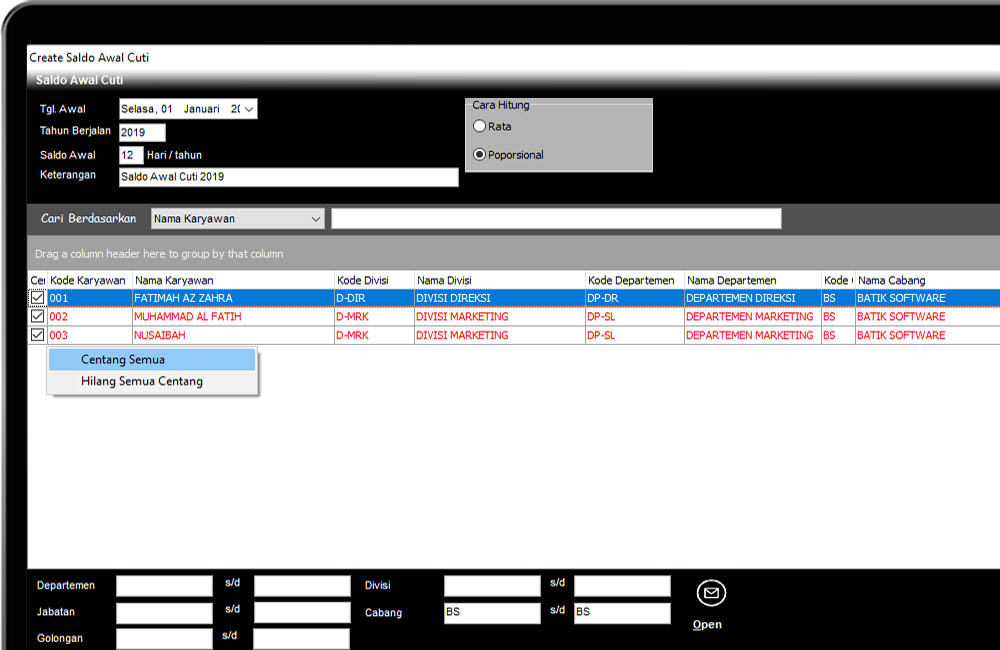 Saldo Awal Cuti merupakan fitur dimana jatah cuti karyawan setiap tahunnya akan di tambahkan. Penambahan saldo awal cuti di Batik Profesional sangatlah mudah dan cepat, karena Anda tinggal pilih karyawan dan masukkan jumlah cuti kemudian proses. Terdapat 2 metode pemrosesan saldo awal, yakni Rata-rata dan Proporsional.