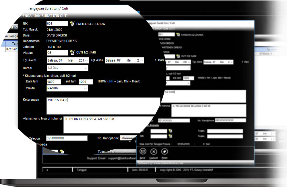 Surat Izin dan Cuti pada Batik Profesional mengenal adanya 1/2 hari, apabila karyawan tersebut melakukan cuti 1/2 hari maka saldo cuti akan berkurang 0,5. Izin dan Cuti 1/2 hari pada Batik Profesional tidak dapat dengan mudah dimanipulasi oleh karyawan, karena fitur ini akan membaca jam masuk dan jam keluar aktual karyawan. Akan diketahui apakah karyawan izin /cuti 1/2 hari pada jam awal, tengah hari atau jam pulang.