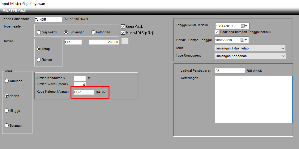 Kode Kehadiran : Klik 2x untuk mengambil kode kategori alasan kehadiran, untuk menentukan kode kehadiran. Sehingga dapat diketahui bahwa setiap ada kehadiran, maka karyawan akan mendapatkan insentif.