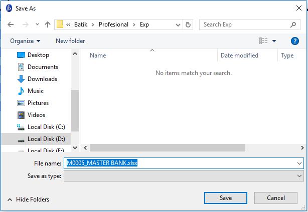 2. Maka muncul jendela untuk menyimpan file export, pilih folder kemudian isi nama file dan extention file kemudian klik Save untuk menyimpan.