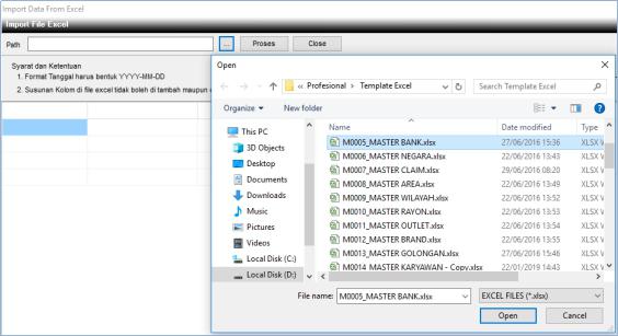 3. Maka muncul jendela Import File Excel, pilih Elipsis untuk mengambil file yang akan diimport dengan nama file M0005_MASTER BANK.xls (harus ada di folder Template Excel).
