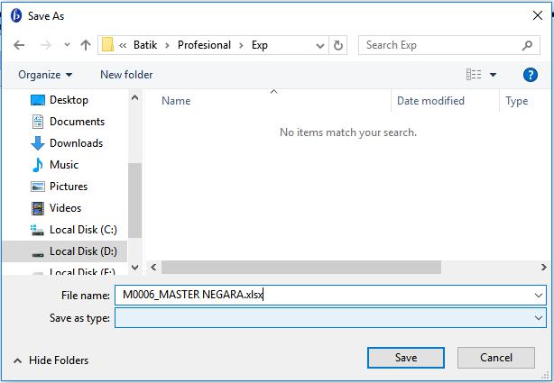 2. Maka muncul jendela untuk menyimpan file export, pilih folder kemudian isi nama file dan extention file kemudian klik Save untuk menyimpan.