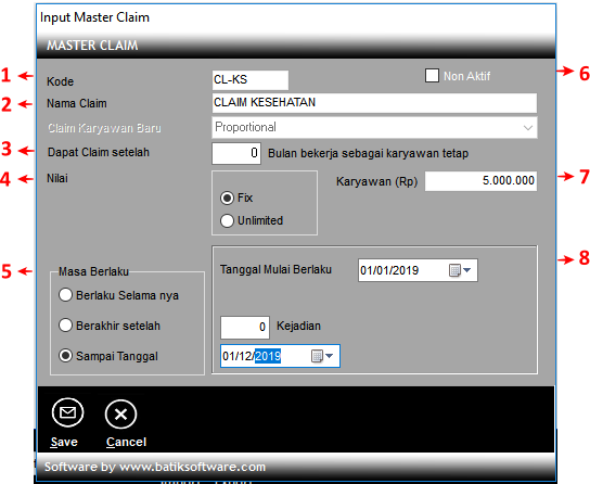 - Claim tidak boleh dihapus atau diubah kodenya jika sudah dipakai untuk Data Karyawan karena mengakibatkan kerusakan data.