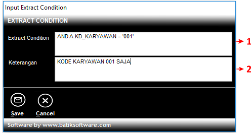 Menu ini digunakan untuk menginput data extract condition, yaitu kondisi-kondisi berupa formula yang dimungkinkan ketika user hendak membuka report dengan kondisi tidak adany parameter yang ada dikolom parameter. Karena user memiliki batasan tersendiri untuk membuka report, sehingga disediakan menu ini untuk menginput kemungkinan pada saat membuka report.