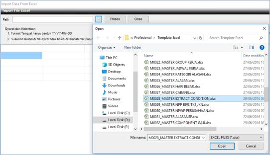 3. Maka muncul jendela Import File Excel,  pilih  Elipsis  untuk mengambil file yang akan diimport dengan nama file M0028_MASTER EXTRACT CONDITION.xlsx (harus ada di folder Template Excel).