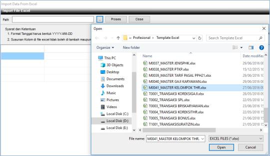 3. Maka muncul jendela Import File Excel,  pilih  Elipsis  untuk mengambil file yang akan diimport dengan nama file M0041_MASTER KELOMPOK THR.xlsx (harus ada di folder Template Excel).