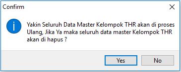 4. Klik Proses untuk mulai melakukan proses import, maka akan tampil pemberitahuan sebagai berikut. Pilih Yes  untuk melanjutkan (seluruh data master Kelompok THR yang lama akan terhapus) atau No  untuk membatalkan.