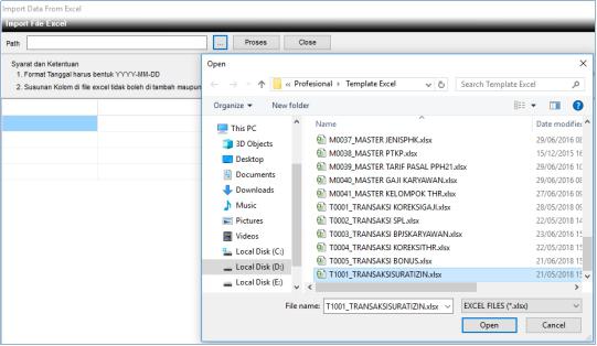 3. Maka muncul jendela Import File Excel, pilih elipsis untuk mengambil file yang akan diimport dengan nama T1001_TRANSAKSISURATIZIN.xlsx (harus ada di folder Template Excel).