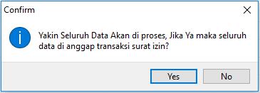 4. Klik Proses untuk mulai melakukan proses import, maka akan tampil pemberitahuan sebagai berikut. Pilih Yes untuk melanjutkan (seluruh data transaksi Surat Izin yang lama akan terhapus) atau No untuk membatalkan.