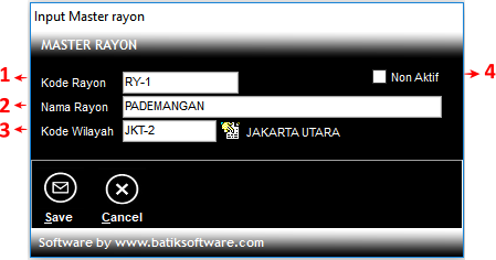 - Rayon tidak boleh dihapus atau diubah kodenya jika sudah dipakai pada Outlet, karena akan mengakibatkan data Outlet berantakan.