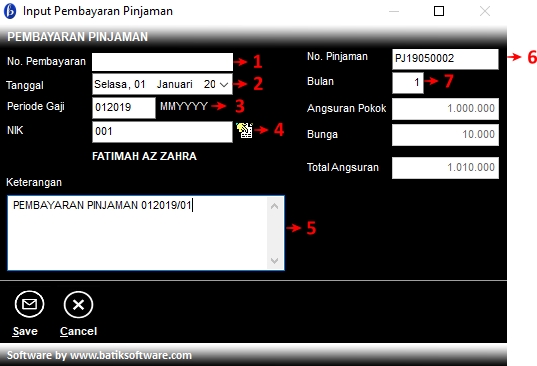 4 | NIK | Klik 2x untuk mengambil kode karyawan yang melakukan pembayaran pinjaman |