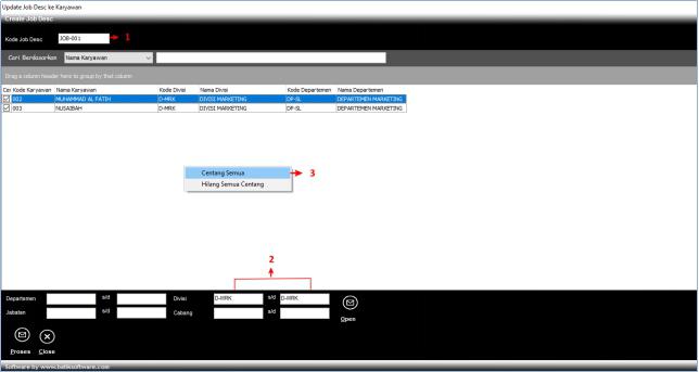 3. Setelah mengambil kode job desc dan memilih karyawan yang akan diberikan job desc tersebut, selanjutnya klik2x tombol Proses untuk memprosesnya.