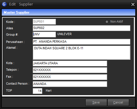 ** Apabila data supplier sudah tidak digunakan, jangan dihapus namun di nonaktifkan.