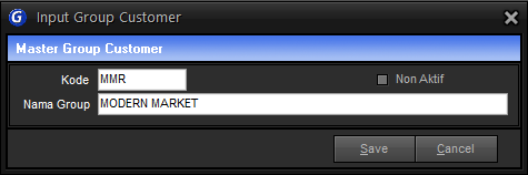 Kode | Diisi kode group customer maksimal 3 karakter, bisa angka maupun huruf |