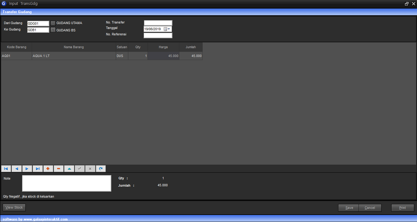Qty | Diisi kuantitas barang yang akan di transfer, isi minus jika akan mengeluarkan barang dari gudang asal |