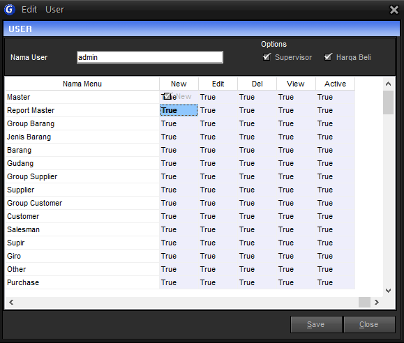 Del | Klik sampai muncul True, jika user bisa menghapus data pada menu tsb |