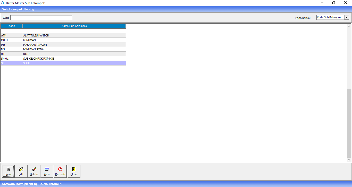 Menu Sub Kelompok merupakan turunan dari menu Kelompok barang, bagian yang lebih kecil dari Kelompok Barang. Contoh Kelompok Barang = Mie Korea, SubKelompok Barang = Mie Samyang.