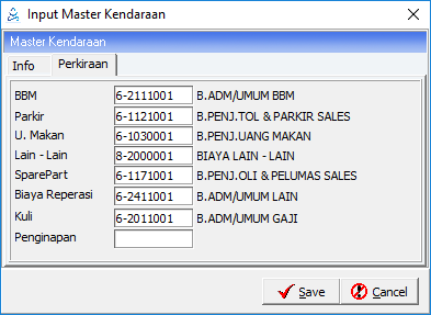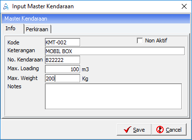 Menu ini digunakan untuk menginput data kendaraan yang biasanya dipakai untuk packing barang yang akan dikirim ke customer.