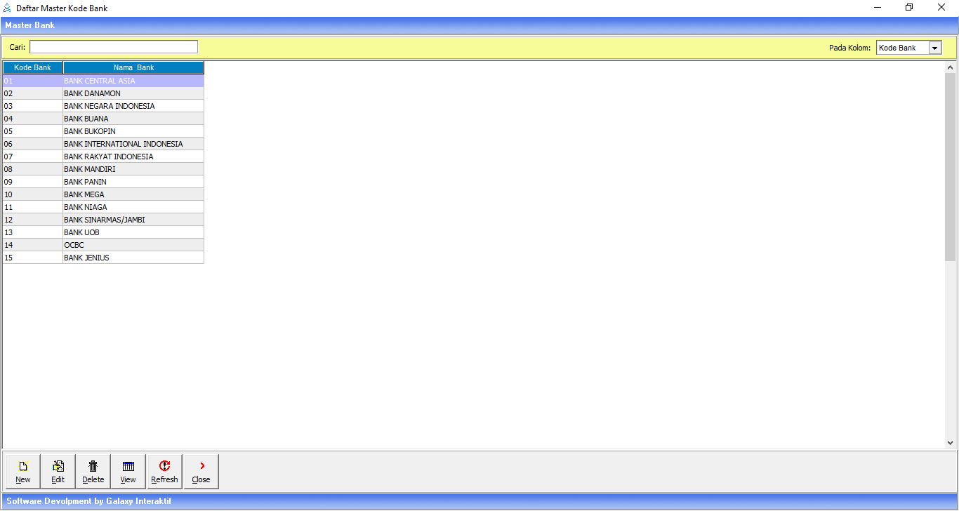 Master Bank digunakan untuk menampung daftar Bank yang ada, nantinya master ini akan digunakan pada saat user membuat buku bank dan giro pada modul Kasir.