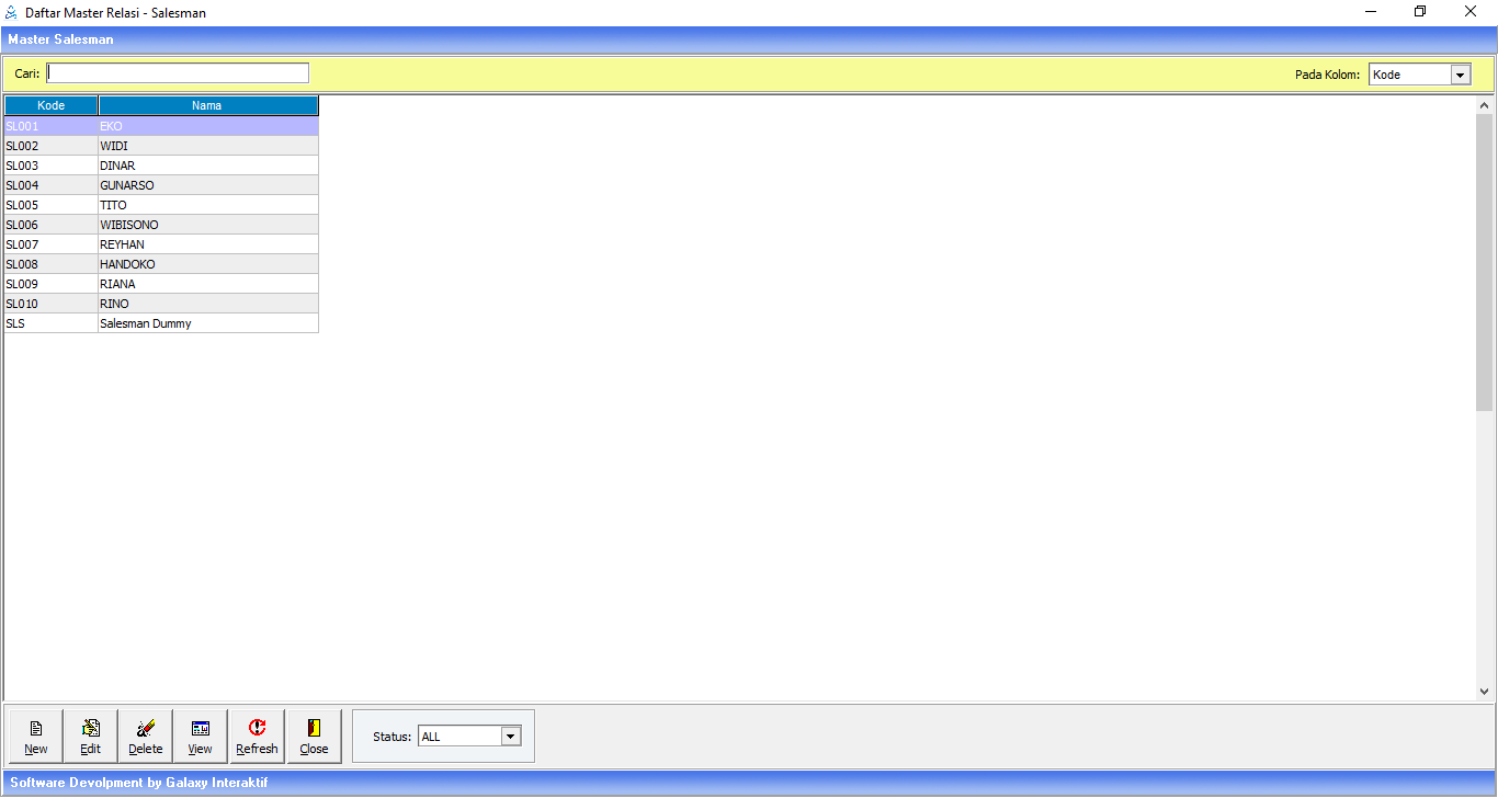 2. Master ini jangan dihapus jika sudah dipakai untuk data transaksi karena akan merusak data transaksi tersebut, jika salesman sudah  tidak digunakan lebih baik dinon-aktifkan saja.