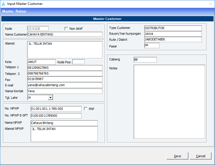 Kode/ Non Aktif | Diisi kode calon customer/ Checklist non aktif hingga muncul tanda cheklist jika data sudah tidak digunakan. |