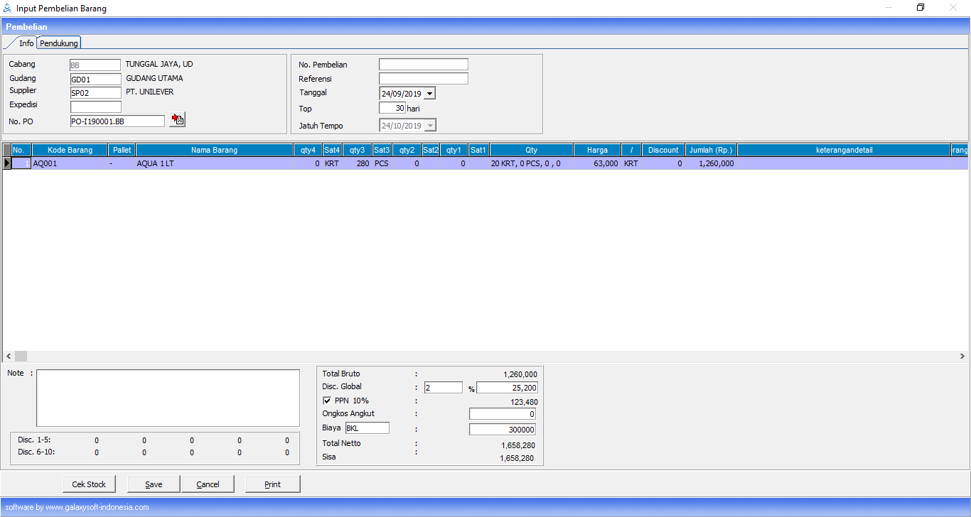 Disc.Global | Kolom diskon global akan kosong walaupun di PO sudah diisi, isi kembali kolom presentase diskon jika ada diskon nota. |