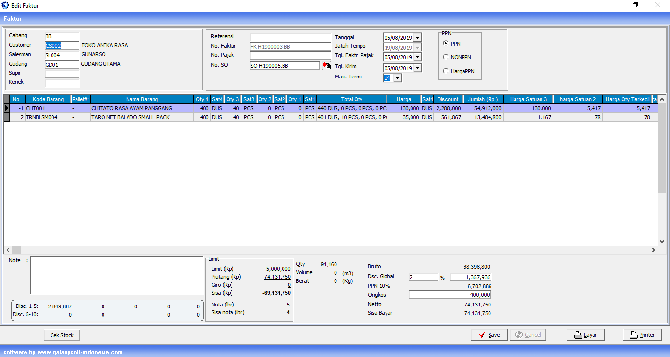Menu ini untuk mencatat setiap transaksi penjualan baik kredit maupun tunai yang dilakukan oleh perusahaan dengan melalui faktur terlebih dahulu maupun penjualan langsung tanpa dilakukan faktur sebelumnya. Dengan dibuatkannya faktur penjualan secara otomatis stok di gudang akan berkurang dan piutang customer akan bertambah.