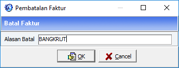 2)  Akan tampil jendela Faktur Penjualan, klik Batal   untuk membatalkan faktur, kemudian tampil jendela Alasan Batal Faktur. Masukkan alasan mengapa faktur tersebut dibatalkan, kemudian klik OK  untuk melanjutkan. Pada menu Faktur Batal maka akan muncul data faktur yang telah dibatalkan sbb: