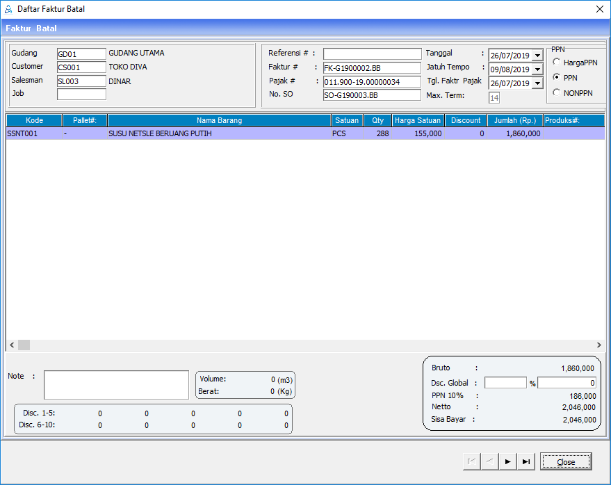 2. Faktur yang telah dibatalkan akan membatalkan jumlah piutang customer dan stok barang difaktur yang telah dibatalkan akan kembali kegudang.