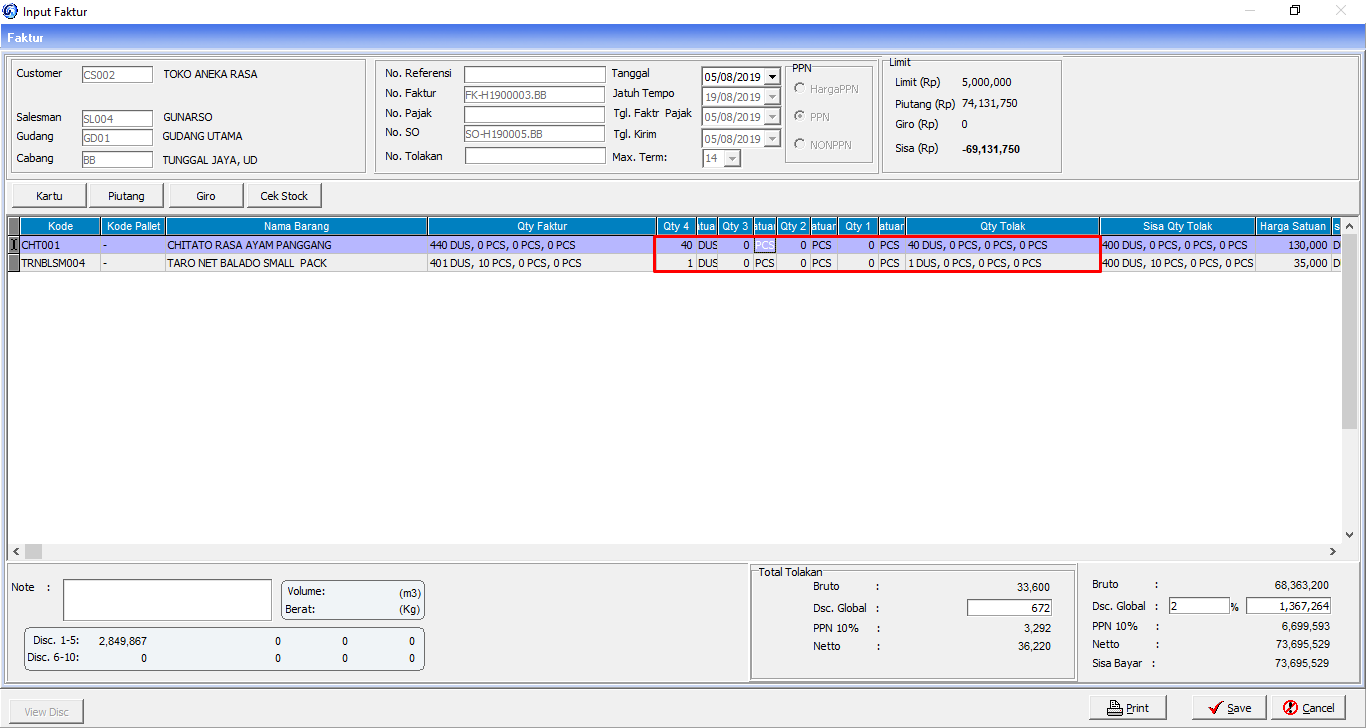 Disc.Global | Default muncul jika faktur yang barangnya akan ditolak memiliki disc.global, namun disc.global tersebut bisa diubah. |