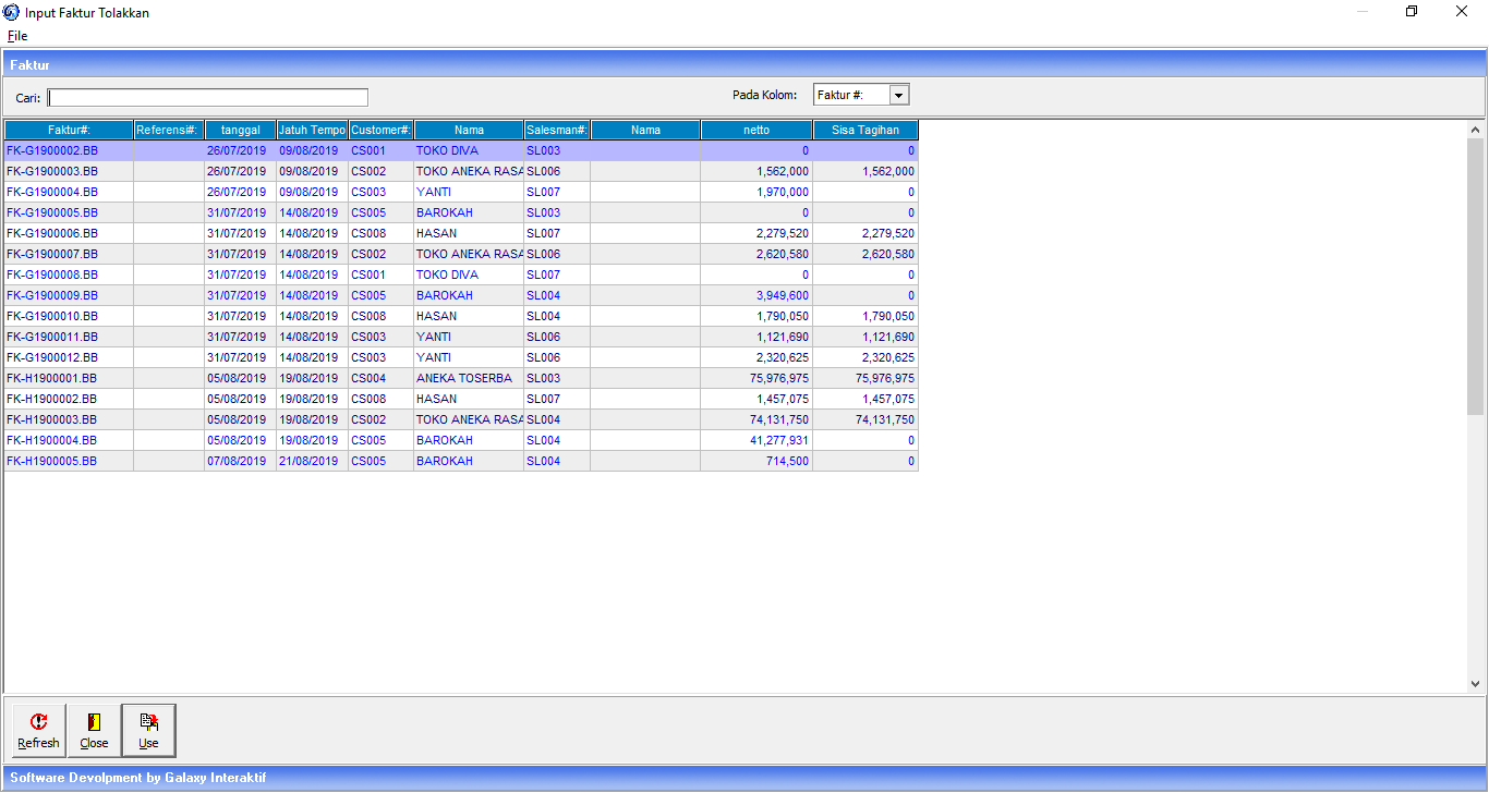 Menu Faktur tolakan ini fungsinya adalah untuk menginput faktur-faktur yang ditolak oleh customer secara langsung ketika barang tiba ditempat karena beberapa alasan, contoh ketika barang tiba saat dicek barang yang dibawa tidak sesuai pesanan dll.
