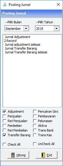 2. Atur Bulan dan Tahun -> ceklis kolom Adjusment dan Transfer Barang -> klik hitung.