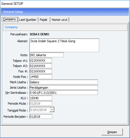 Default muncul nama perusahaan sesuai settingan di database dan tidak bisa diubah manual pada menu ini. Apabila ada perubahan untuk indentitas perusahaan, silakan hubungi PT Galaxy Interaktif. |