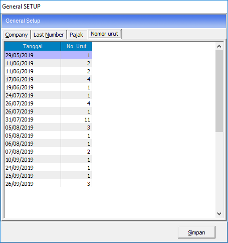 Tab ini berisi histori penggunaan nomor urut sesuai transaksi setiap periodenya. Misal periode 201905 baru dibuatkan 1 transaksi Faktur dengan nomor FK-E1900001.BB, maka nomor urut yang terakhir digunakan tsb adalah 1. Jika dibuatkan Faktur yang ke 2 maka nomor faktur FK-E1900002.BB, sehingga No. Urut untuk Faktur di tab Last Number akan muncul 2 untuk periode 201905. Last Number ini berlaku untuk semua transaksi yang ada di SEBAS.