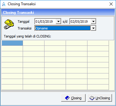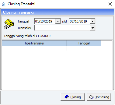 ini digunakan untuk menutup data yang telah selesai dilakukan, misalkan data bulan lalu telah diperiksa dan telah benar maka lakukanlah proses closing transaksi. Transaksi tersebut ditutup berdasarkan tgl transaksi dan jenis transaksi.