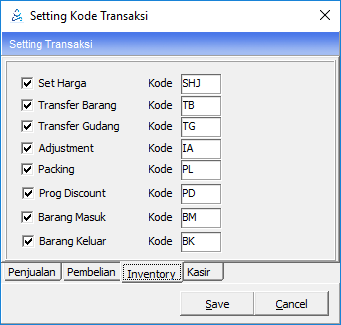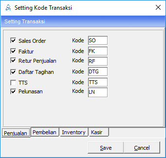 Menu Setting kode transaksi merupakan pengaturan kode untuk setiap transaksi seperti transaksi penjualan, pembelian, inventory, kasir, dan kanvas. Buka Modul Utility -> Setting Kode Transaksi. Terdapat beberapa tab yang harus di setting.
