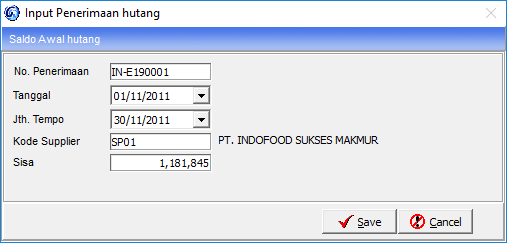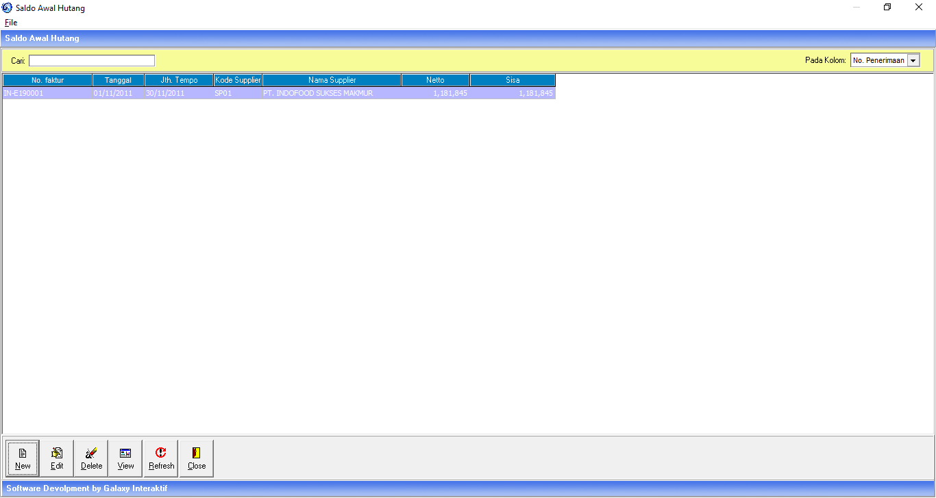 Hutang dagang pada aplikasi Galaxy Interaktif menggunakan konsep ‘open item’ seperti piutang dagang di atas maka nota hutang awal harus di input per nota tetapi perincian barangnya tidak perlu dimasukkan.