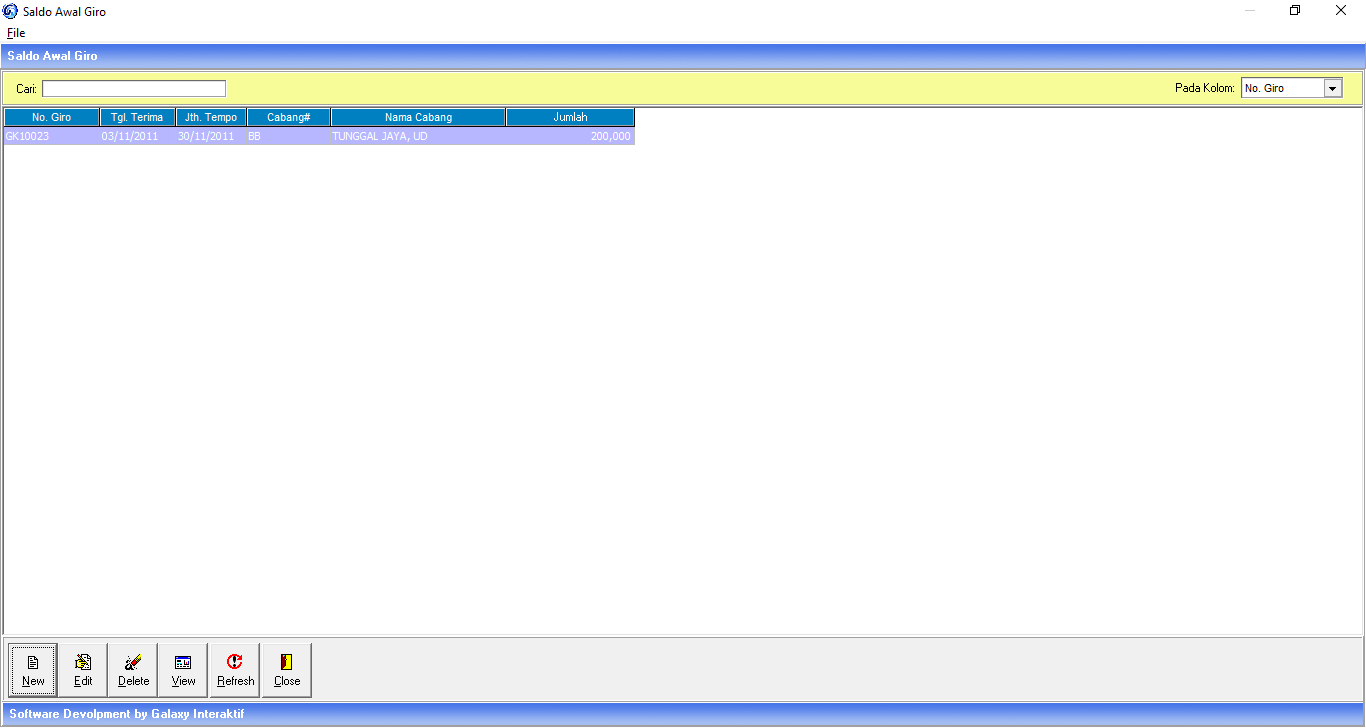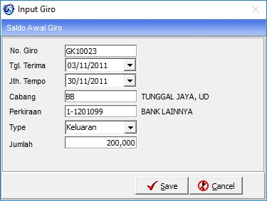 Menu ini digunakan untuk menampung nomor giro yang belum dicairkan dan masih ada sisa, giro yang diinput disaldo awal ini tidak akan berpengaruh terhadap nilai perkiraan yang menampung giro karena hanya sebagai catatan saja.