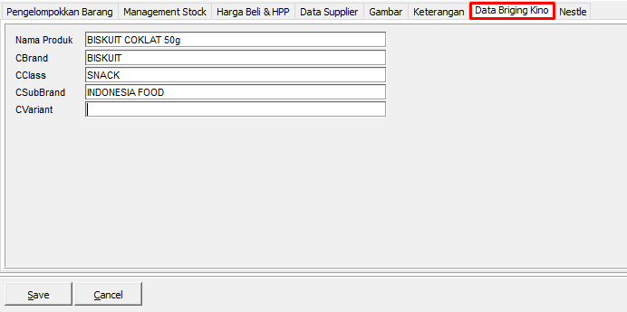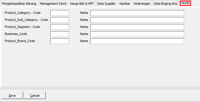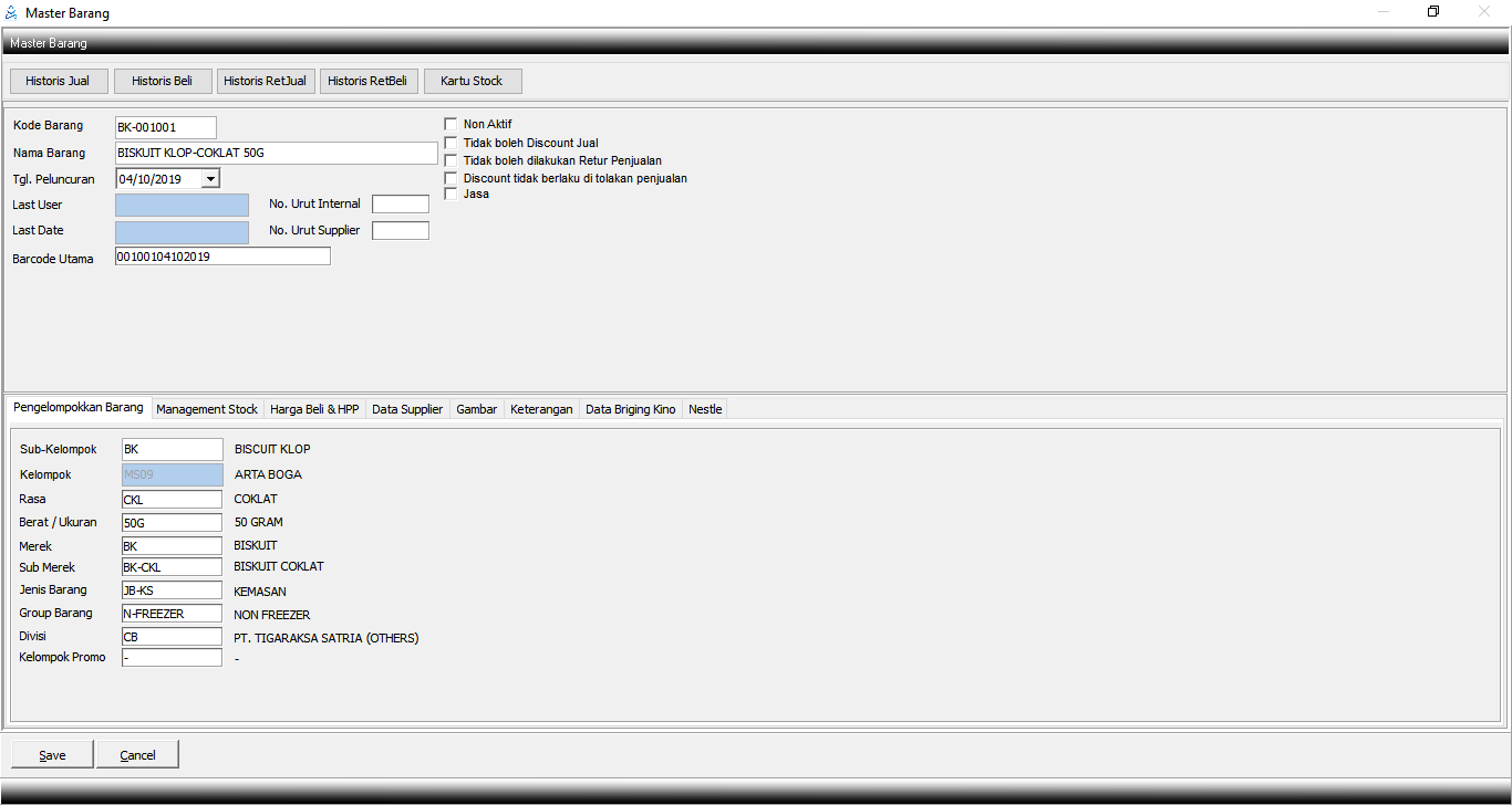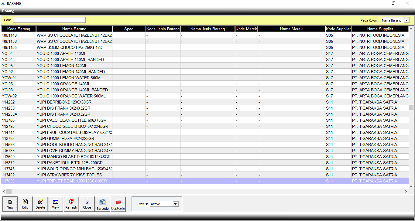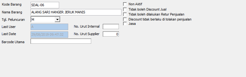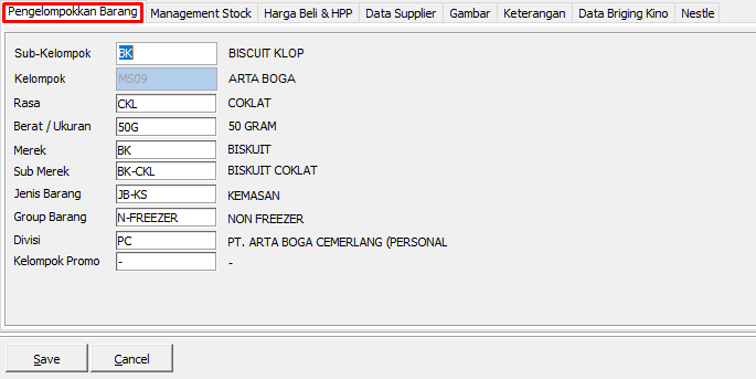 Menu ini digunakan untuk menginput kode dan nama barang beserta rincian yang sebelumnya diinput pada master seperti Sub Kelompok, Rasa, Berat, Merek, Jenis Barang, Divisi dll.