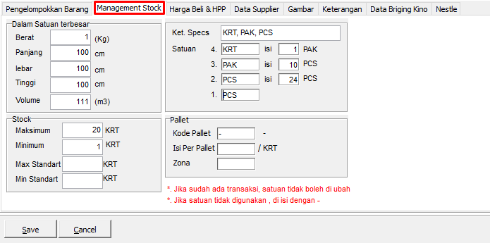 • Jika sudah ada transaksi, satuan tidak boleh diubah dan sebaiknya buat barang baru.