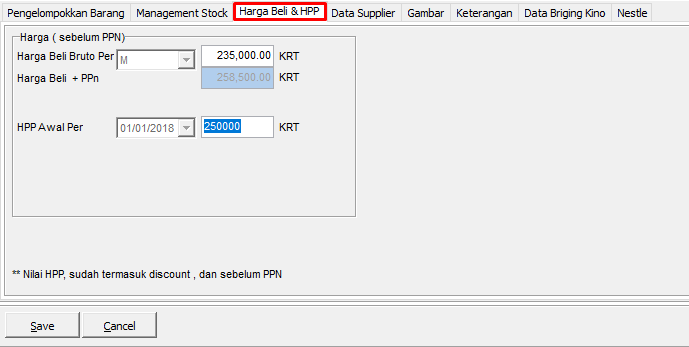 1 Harga Beli Bruto per Diisi harga beIi awal barang dari supplier sebelum PPN dan sebelum diskon.
