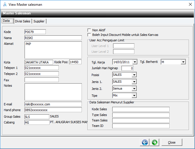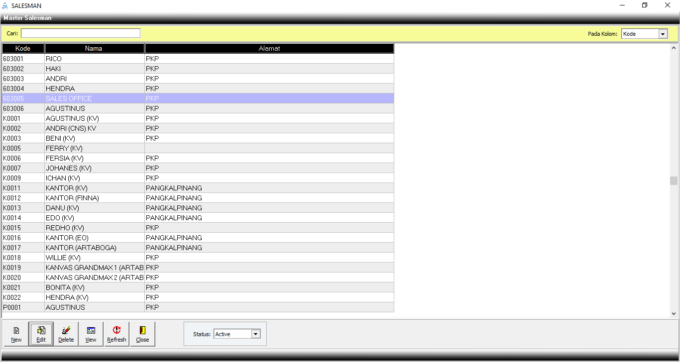 2. Master ini jangan dihapus jika sudah dipakai untuk data transaksi karena akan merusak data transaksi tersebut, jika salesman sudah  tidak digunakan lebih baik dinon-aktifkan saja.