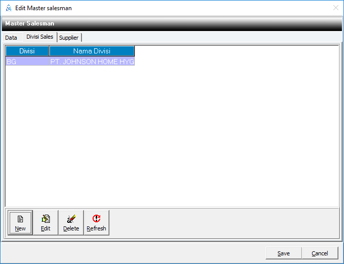 Tab ini berisi data divisi yang bisa dipegang oleh sales, klik New untuk menambah data.