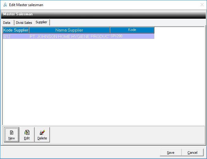 Tab ini diisi data kode sales berdasarkan supplier, biasanya dipakai untuk sinkronisasi data dengan program interface supplier. Klik New untuk menambah data.