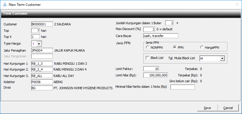 Diisi jumlah rupiah limit piutang yang diberikan ke customer.