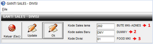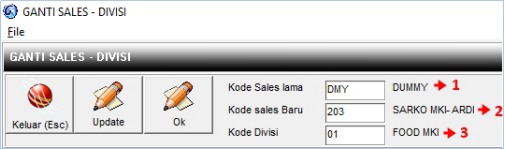 Sales lama keluar, digantikan dengan sales baru. Contoh sales 202 keluar, semua customer yang dipegang sales 202 dengan divisi 01 akan dipindahkan ke salesman 203.